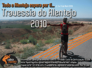 Aproveitando as férias de Páscoa, de 2 a 4 de Abril, a Cabra Montêz a realização da Travessia de BTT do Alentejo. A Travessia consta de um conjunto de 3 etapas, com início na Vila Branca de Serpa, e conclusão na Vila de Sagres. As etapas previstas têm distâncias compreendidas entre 97 e 123 km, sendo a primeira realizada entre Serpa e Ourique, com um total de 97 km, a segunda entre Ourique e a Zambujeira do Mar com uma extensão de 123 km, e a última etapa que liga a Zambujeira do Mar a Sagres com uma extensão de 102 km.