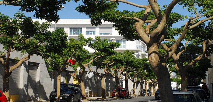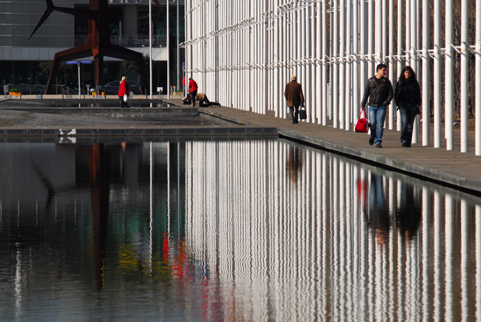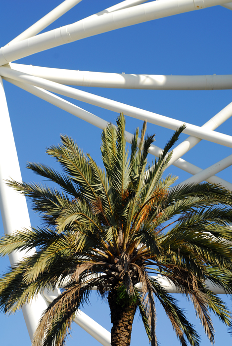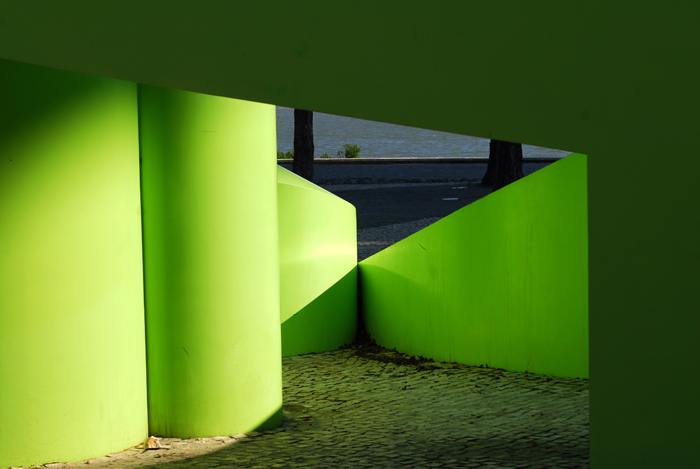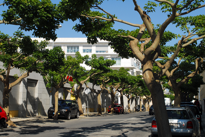 O meu ponto de partida foi junto à renovada Marina do Parque das Nações que passado mais de 10 anos sobre a sua inauguração volta à actividade para que foi concebida. Esta é uma área das mais conseguidas de todo o nosso percurso devido à menor pressão de edificação. A arquitectura existente está muito relacionada, ao nível da forma, com paquetes e é interessante observar as influências. A zona ribeirinha é ampla e com espaços ajardinados que podem ser observados de uma posição superior, se nos deslocarmos aos espaços existentes entre prédios. Numa dessas incursões deparei com as árvores da rua podadas que conferem ao espaço um ambiente muito agradável e um aspecto visual interessante.