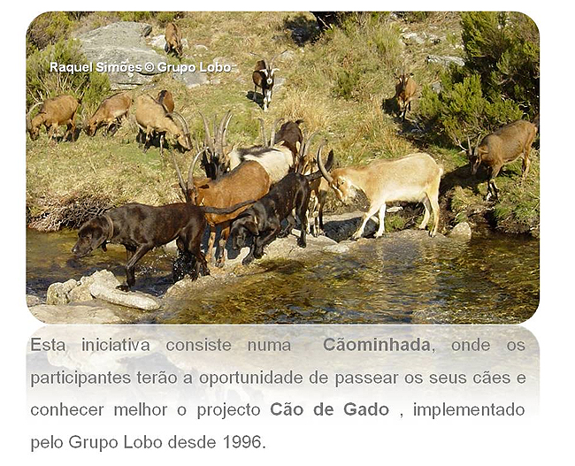O Grupo Lobo e a Liga para a Protecção da Natureza promovem a iniciativa “Cães de Gado”. Uma iniciativa que envolve a apresentação do livro “Cães de Gado” de Paulo Caetano. Sílvia Ribeiro & Joaquim Pedro, e uma “Cãominhada”, uma caminhada onde os interessados podem escolher participarem levando o seu cão, no caso de este ser considerado raça “Cão de gado” (Castro Laboreiro, Serra da Estrela, Rafeiro do Alentejo, Cão de Gado Transmontano). A apresentação do Livro em questão será realizada durante a caminhada.