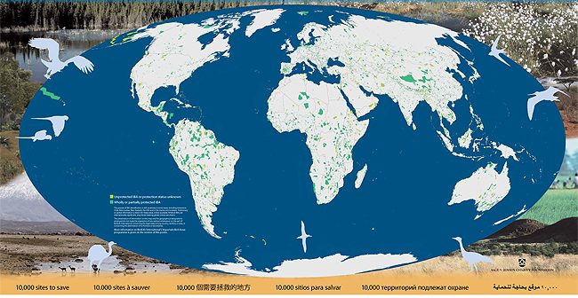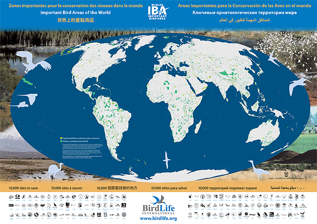 As Áreas Importantes para as Aves (IBAs) são reconhecidas mundialmente como uma ferramenta prática para a conservação da natureza, permitindo concentrar esforços e optimizar acções de conservação. Com a publicação deste novo mapa mundial das IBAs, a BirdLife está a expor as lacunas na rede mundial de áreas protegidas. Apenas 59% dos sítios são mostrados em verde-escuro, indicando que eles são total ou parcialmente protegidas, os restantes sítios são mostrados em verde-claro, indicando que não têm qualquer estatuto de protecção.