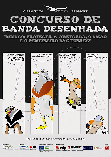 A Liga para a Protecção da Natureza no âmbito das acções de Educação Ambiental do Projecto LIFE Estepárias (Conservação da Abetarda, Sisão e Peneireiro-das-torres nas estepes cerealíferas do Baixo Alentejo) LIFE07/NAT/P/654, com o apoio da Bedeteca de Beja promove o Concurso de Banda Desenhada “Missão: proteger a Abetarda, o Sisão e o Peneireiro-das torres”.