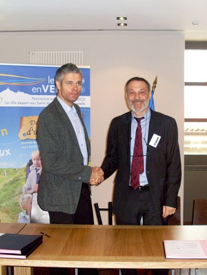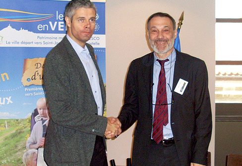 O conselheiro de Cultura e Turismo, Roberto Varela, o ministro francês de Assuntos Europeus e alcaide de Le Puy-en-Velay, Laurent Wauquiez, assinaram os estatutos de constituição da Federação Europeia dos Caminhos de Santiago