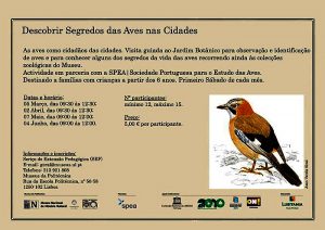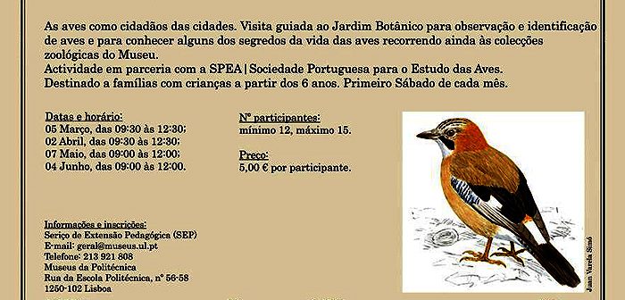 Visita guiada ao Jardim Botânico para observação e identificação de aves e para conhecer alguns dos segredos da vida das aves recorrendo ainda às colecções zoológicas do Museu. Actividade organizada pelo Museu Nacional de História Natural de Lisboa, em parceria com a SPEA. Realiza-se no primeiro Sábado de cada mês e tem a duração de cerca de 3 horas.