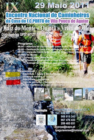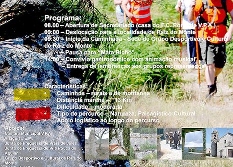 Programa: 08.00 – Abertura de Secretariado (casa do F.C. Porto de V.P.A.) 09:00 – Deslocação para a localidade de Raiz do Monte 09:30 – Início da Caminhada – Sede de Grupo Desportivo e Cultural de Raiz do Monte – Pausa para “Mata Bicho” 14:00 – Convívio gastronómico com animação musical – Entrega de lembranças aos grupos representados Características: • Caminhos – rurais e de montanha • Distância marcha – 13 Km • Dificuldade – moderada • Tipo de percurso – Natureza, Paisagístico-Cultural • Apoio logístico ao longo do percurso