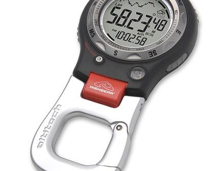 Altímetro desenvolvido com um mosquetão metálico que permite que seja anexado ao cinto, mochila, vestuário ou em qualquer outro lugar que seja necessário.