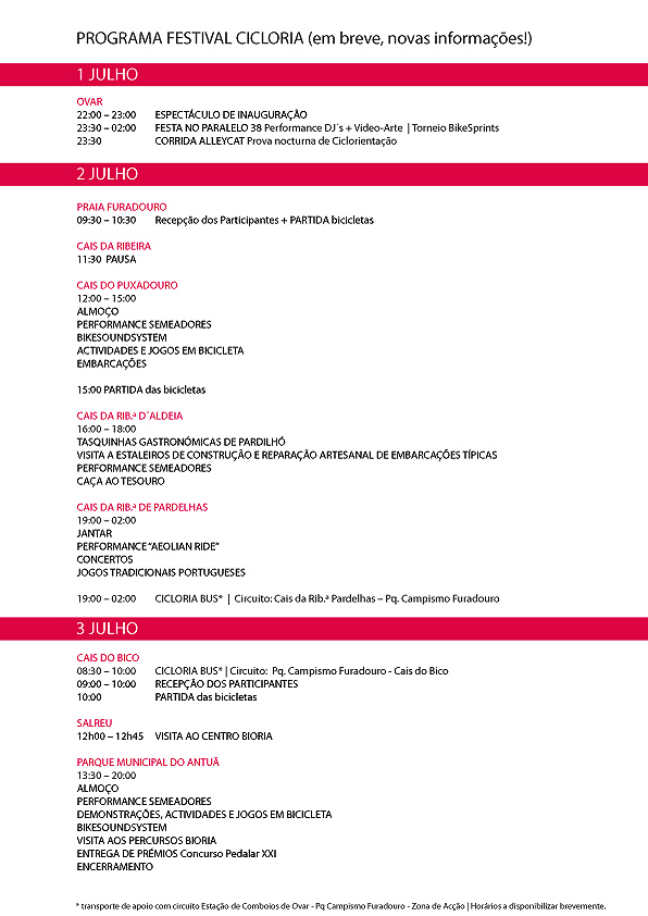 O Festival Itinerante CicloRia convida-te a pedalar pelas paisagens da Ria num encontro com a cultura, a gastronomia, a natureza e as gentes da terra. Um itinerário suave, agitado pelas actividades em bicicleta, embarcações típicas, jogos, artes e concertos musicais.
