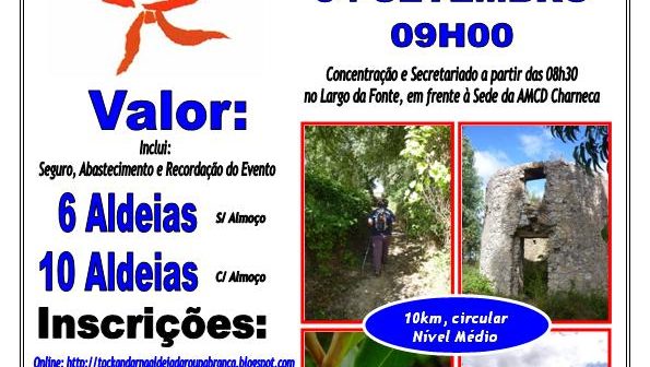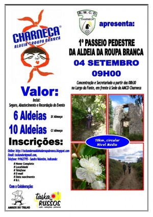 Inserido nas Festas da Aldeia da Roupa Branca, que retrata uma aldeia saloia do final do séc. XIX, com tudo o que era típico desta época e cultura, este 1º Passeio Pedestre será circular, com 10km, de nível médio, por trilhos de terra batida e pelo meio da vegetação, através de zonas rurais, com passagem e subida a 3 dos vários moinhos desta zona, exemplificando alguns dos trajectos que eram feitos pelos charniqueiros (habitantes da Charneca) em finais do séc. XIX e início do séc. XX.