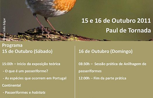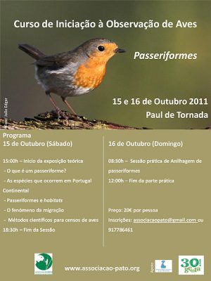 Nos dias 15 e 16 de Outubro a Associação PATO irá organizar um curso sobre Iniciação à Observação de Aves – Passeriformes. Nesta actividade os participantes terão oportunidade de conhecer um pouco mais sobre a ecologia das várias espécies de passeriformes que ocorrem em Portugal Continental. Aspectos como a Migração e métodos de censos de aves serão também abordados, oferecendo uma perspectiva abrangente e enriquecedora da avifauna Portuguesa. O curso conta ainda com uma parte prática, onde os participantes poderão assistir a uma sessão de anilhagem científica de aves.