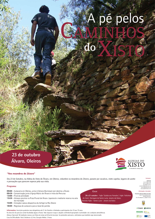 O Município de Oleiros, em parceria com as Aldeias do Xisto, Junta de Freguesia de Álvaro e Waypoint, levam a efeito, no próximo dia 23 de Outubro, mais uma iniciativa que integra o ciclo de percursos pedestres que se desenvolvem na envolvência das Aldeias do Xisto, denominado “A pé dos Caminhos do Xisto”. Após o “Mui nobre Villa”, no passado dia 25 de Setembro, quem não pôde participar poderá agora desvendar os “Meandros do Rio Zêzere”. Assim, este ciclo de caminhadas estará de volta a Álvaro, no penúltimo Domingo de Outubro, onde poderá vislumbrar uma fantástica paisagem classificada pela UNESCO, passear por socalcos, visitar lagares de azeite e povoações que parecem esperar pela sua visita.