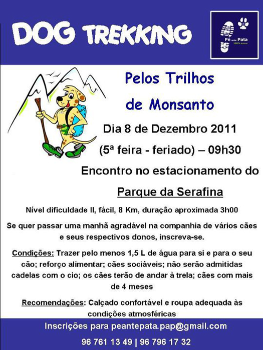 08 de Dezembro – Dog Trekking pelos Trilhos de Monsanto 0 Por Passear em 29 de Novembro de 2011 Blog, Eventos Partilhe Twitter Facebook Google+ Pinterest LinkedIn Tumblr Email