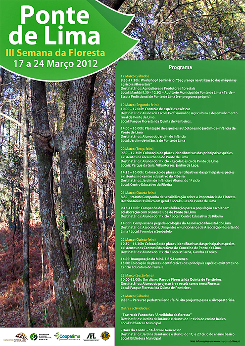 A semana começa com a realização de um seminário, que decorre na parte da manhã no auditório municipal de Ponte de Lima e de tarde na Escola Profissional Agrícola e de Desenvolvimento Rural de Ponte de Lima onde será abordada a segurança na utilização de máquinas agrícolas e florestais. Sensibilizar os agricultores/produtores florestais para a importância das normas de segurança, evitando assim acidentes que normalmente provocam vítimas mortais, são os objetivos desta ação. Da parte da tarde haverá uma exposição/demonstração prática de como cumprir essas regras. As restantes atividades serão quase todas dirigidas à população escolar, com a participação de cerca de 800 alunos do concelho com excepção do dia 21 onde haverá uma campanha para a população em geral nas ruas de Ponte de Lima. O objectivo desta atividade é alertar as pessoas para a importância da floresta, sensibilizando-as para a sua preservação.