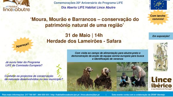 O projecto LIFE – Natureza ‘Promoção do Habitat do Lince-ibérico e do Abutre-preto no Sudeste de Portugal’ (de acrónimo LIFE Habitat Lince Abutre), convida todos os interessados para o Dia Aberto LIFE Habitat Lince Abutre: ‘Moura, Mourão e Barrancos – conservação do património natural de uma região’, que terá lugar no dia 31 de Maio (quinta-feira) pelas 14h na Herdade dos Lameirões, em Safara – Moura.