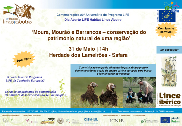 Este evento, que conta a colaboração da DRAP Alentejo, realiza-se no âmbito das comemorações dos 20 anos do Programa LIFE e tem como objectivo divulgar este instrumento financeiro de conservação da Natureza, através da apresentação de vários projectos LIFE – Natureza que nos últimos anos têm contribuído para a conservação da biodiversidade na região de Moura, Mourão e Barrancos (programa em anexo).