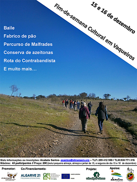 Fim de semana, 15 e 16 de dezembro – À semelhança do ano passado, a Almargem voltou a fazer uma parceria com o Clube Desportivo de Vaqueiros e organiza um fim de semana cultural! No sábado caminhada no Percurso Pedestre em Malfrades, e no domingo percorrer um dos percursos da Rota do Contrabandista! O dia de sábado será repleto de atrativos culturais, gastronomia local que conta com pequeno-almoço, almoço e jantar, confeção de pão, conserva de azeitonas, baile, e muito mais!