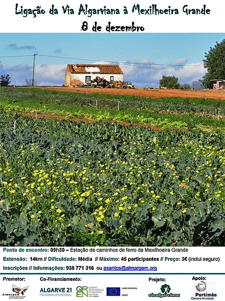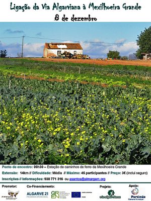 Sábado, 08 de dezembro, – Ligação da Via Algarviana à Mexilhoeira Grande. Apesar de esta ligação ter a extensão de 28km, a organização optou por propor percorrer metade, 14km, desde o Moinho da Rocha até à Mexilhoeira Grande! Esta é uma das ligações com maior diversidade de paisagem, onde os caminhantes terão ainda a oportunidade de conhecer pequenas localidades. A C.M. Portimão disponibilizará autocarro para efetuar transporte desde a Estação de Caminhos-de-ferro até ao Moinho da Rocha.