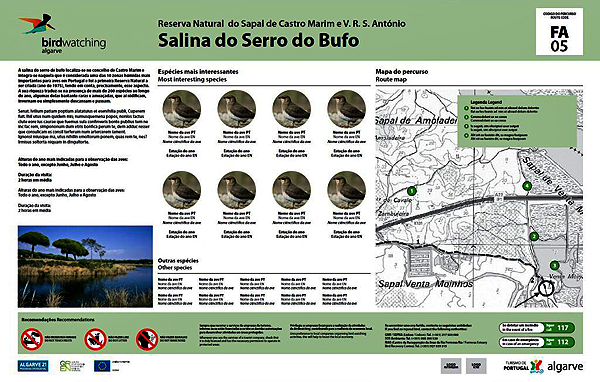A sinalética e os painéis foram desenvolvidos no âmbito do amplo projeto «Birdwatching no Algarve», que tem o apoio financeiro do Programa Operacional Algarve 21 e que envolve (entre outros) as câmaras municipais, a associação Almargem, o Instituto da Conservação da Natureza e das Florestas e o Turismo do Algarve.