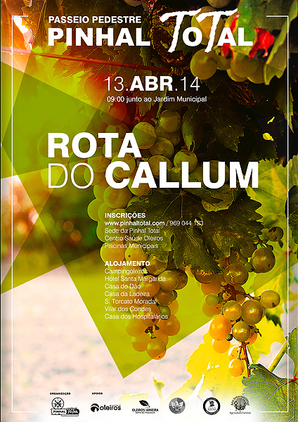 O fim-de-semana de 12 e 13 de abril vai ser dedicado ao Vinho Callum com a realização de umas jornadas técnicas no sábado à tarde e de um passeio pedestre no domingo de manhã. A Rota do Callum, correspondente ao sétimo passeio pedestre promovido pela associação Pinhal Total, vem assim associar-se dar destaque a esta temática, ao mesmo tempo que continua a assinalar a celebração do Ano Internacional da Agricultura Familiar. O passeio tem início pelas 9 horas de domingo, em frente ao Jardim Municipal de Oleiros e os interessados em participar poderão inscrever-se por e-mail info@pinhaltotal.com ou presencialmente nas sede da Pinhal Total, nas Piscinas Municipais e no Centro de Saúde de Oleiros.