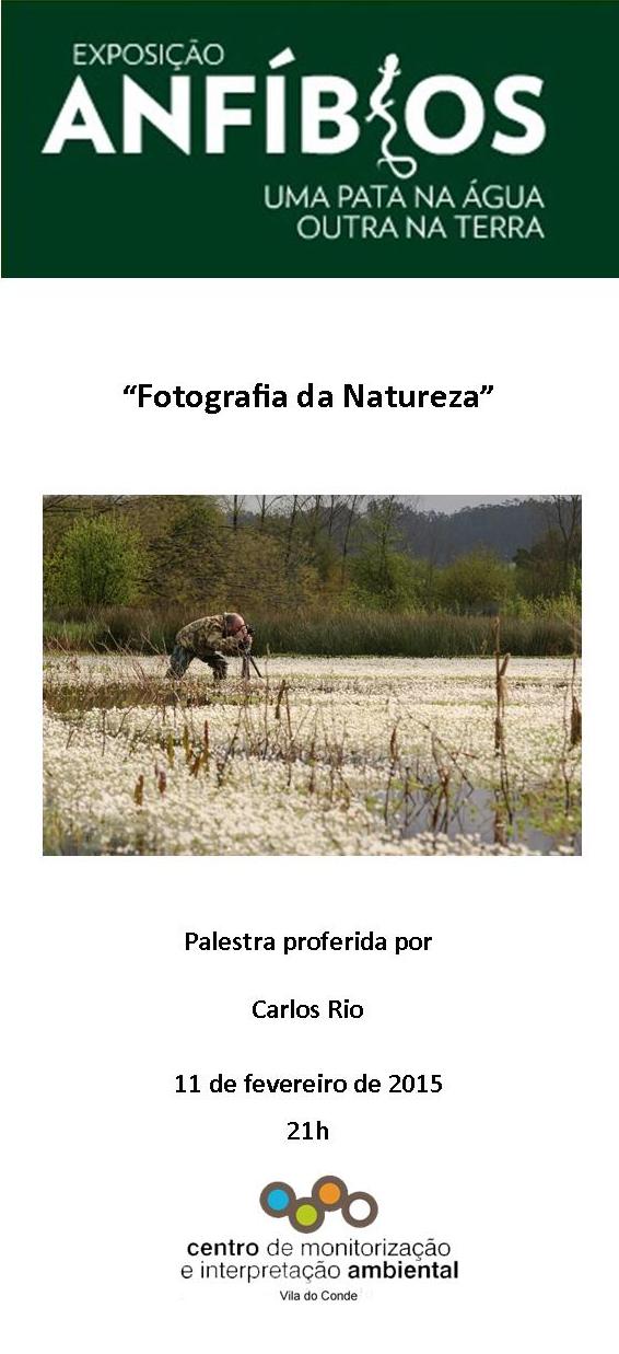 No âmbito da exposição “Anfíbios: uma pata na água, outra na terra” vai realizar-se uma palestra proferida por Carlos Rio subordinada ao tema “Fotografia da Natureza”, que decorrerá no auditório do Centro de Monitorização e Interpretação Ambiental de Vila do Conde, no dia 11 de fevereiro, às 21h.