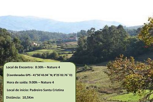 Local de Encontro – 8h30 – Nature 4 (Coordenadas GPS -41°50`43.94“N; 8°25`02.76“O)