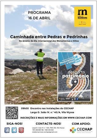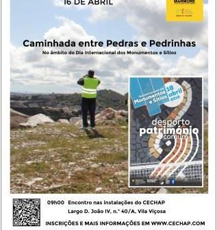 No dia 16 de Abril celebramos o Dia Internacional dos Monumentos e Sítios (18 de Abril) que, este ano, tem o tema “O Património do Desporto”. Esta “Caminhada entre Pedras e Pedrinhas” vai levar os visitantes pelos caminhos do mármore alentejano. O passeio, com cerca de 8 km de extensão, inicia nas instalações do CECHAP, em Vila Viçosa, às 9h00. Conheça o programa, o percurso e as condições em www.cechap.com