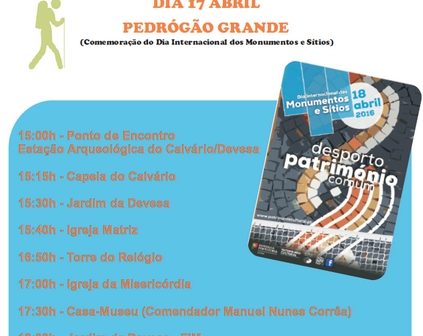 O Município de Pedrógão Grande antecipa o Dia Internacional dos Monumentos e Sítios 2016, realizando a 17 de abril (domingo) um percurso pedestre intitulado “À Descoberta do Património Histórico”, associando-se à iniciativa de âmbito nacional de promoção cultural do ICOMOS (Conselho Internacional dos Monumentos e Sítios) e da DGPC (Direção Geral do Património Cultural), adotando o mote proposto para este ano, “ Desporto, um Património Comum. O roteiro cultural proposto, conta com uma explicação histórica e o enquadramento dos monumentos e sítios a visitar com o objetivo principal de sensibilizar e enaltecer a importância da proteção e da valorização do património edificado. O percurso pedestre “À Descoberta do Património Histórico”, não carece de inscrição pelo que todos/as os/as interessados/as em participar, devem estar junto à Estação Arqueológica do Calvário/Devesa, ponto de partida definido para início da visita ao Centro Histórico da Vila de Pedrógão Grande, pelas 15h00, do dia 17 de abril de 2016. Durante o percurso traçado serão visitados monumentos classificados nomeadamente a Igreja de Nossa Senhora da Assunção, vulgo Igreja Matriz (Monumento Nacional), e a Igreja da Misericórdia (Monumento de Interesse Público) e outros que enobrecem e caracterizam a história de Pedrógão Grande.
