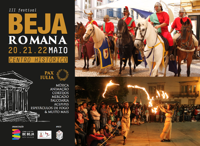 De 20 a 22 de maio, Beja revive a grandeza e imponência de Pax Julia no centro histórico da cidade com um programa repleto de atividades, música, cortejos com cavalos, mercado, falcoaria, acepipes e espetáculos de fogo.
