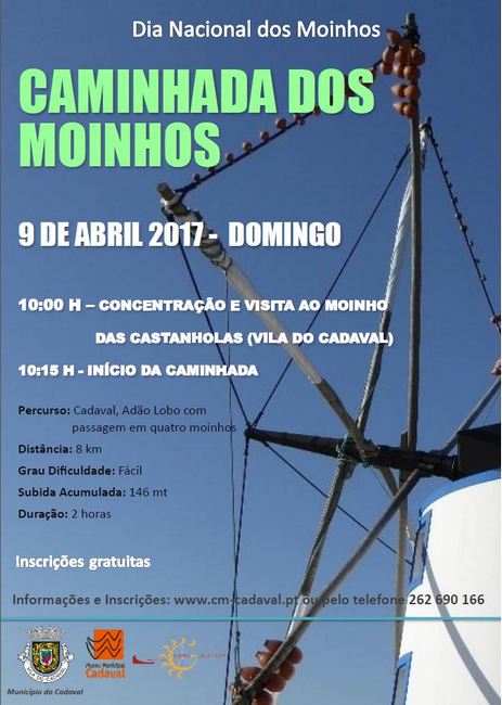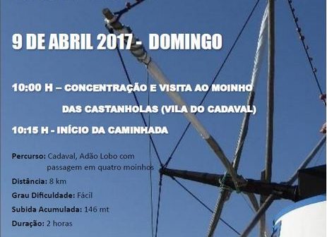 Para assinalar o Dia Nacional dos Moinhos, realiza-se no próximo dia 9 de abril (domingo), pelas 10h00, no Cadaval, a Caminhada dos Moinhos, a qual inclui visita ao Núcleo Museológico do Moinho das Castanholas, ponto de partida da atividade. A participação é gratuita mas sujeita a inscrição, que pode ser feita via site municipal. Inscreva-se até 6 de abril. Participe!
