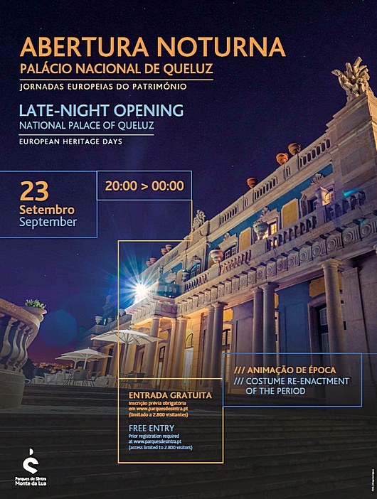 No próximo dia 23 de setembro (sábado) a Parques de Sintra celebra as Jornadas Europeias do Património no Palácio Nacional de Queluz, com uma abertura noturna de entrada livre e com visitas guiadas diurnas ao recém-inaugurado Jardim Botânico. Ambas as atividades exigem inscrição prévia online e têm um número de participações limitado.