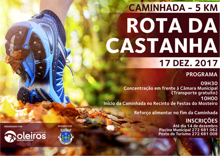 A Caminhada Rota da Castanha tem inscrições abertas até 14 de dezembro na Piscina Municipal (272681062) ou no Posto de Turismo (272681008). Inserida na Mostra dos Frutos de Outono – Medronho e da Castanha, esta caminhada irá realizar-se no dia 17 de dezembro na Freguesia de Mosteiro, com concentração em frente à Câmara Municipal de Oleiros pelas 09H30. O transporte é cedido pelo Município e é gratuito.