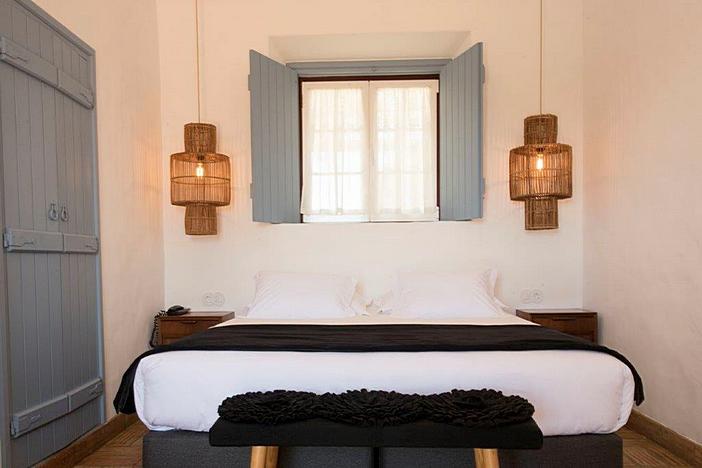 Casas brancas com barras num azul mais suave, mais leve, um pouco marítimo. E sempre o tradicional amarelo, que tanto na imagem gráfica da herdade como na decoração dos espaços, é uma presença marcante, remetendo para o revigorante sol alentejano e para o cereal rei da região. Em termos de outras presenças cromáticas, a decoração dos quartos parte de variantes de azul, cinzento e bordeaux que dão o mote aos elementos decorativos.