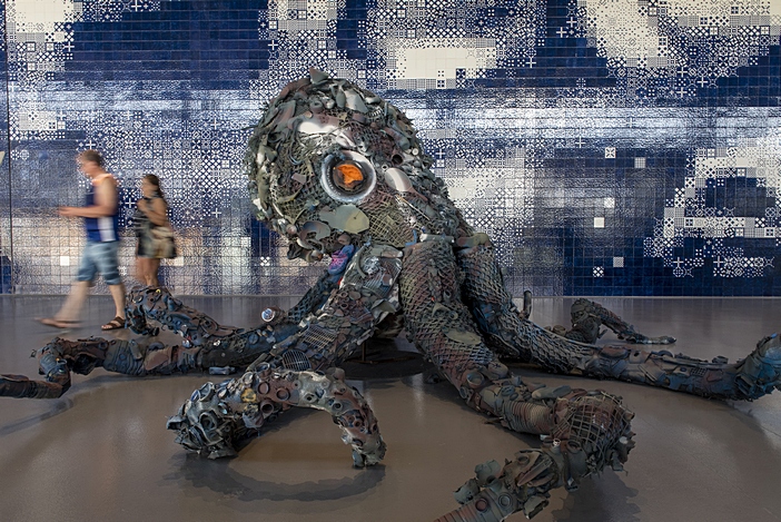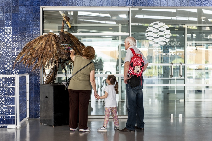 A exposição, da autoria de João Parrinha e Xandi Kreuzeder do “Skeleton Sea – Arte do Mar”, está patente no átrio principal do Oceanário, onde os visitantes poderão contemplar um impressionante peixe feito com chinelos de plástico que vieram parar a uma praia na África do Sul, um enorme polvo construído a partir de lixo encontrado nas praias ou, até, um incrível albatroz construído no Quénia, com lixo marinho, ferro e arame, e que pretende alertar para os perigos a que estão sujeitas as aves marinhas devido à poluição por plástico no oceano.