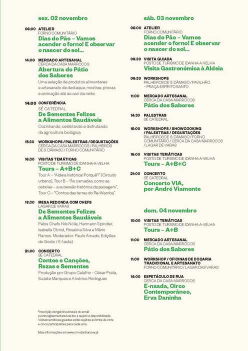É à volta dessa história, de estórias de sementes e das estórias que a terra tem para contar que, entre 2 e 4 de novembro, Idanha-a-Velha vai viver dias de grande animação. Concertos, gastronomia, espetáculos de rua, workshops no forno comunitário, conferências sobre sementes e alimentação saudável, mas também visitas guiadas temáticas são “só” algumas das atividades que vão ser desenvolvidas. No fundo, um extenso e diversificado programa para todas as idades, com entrada gratuita.
