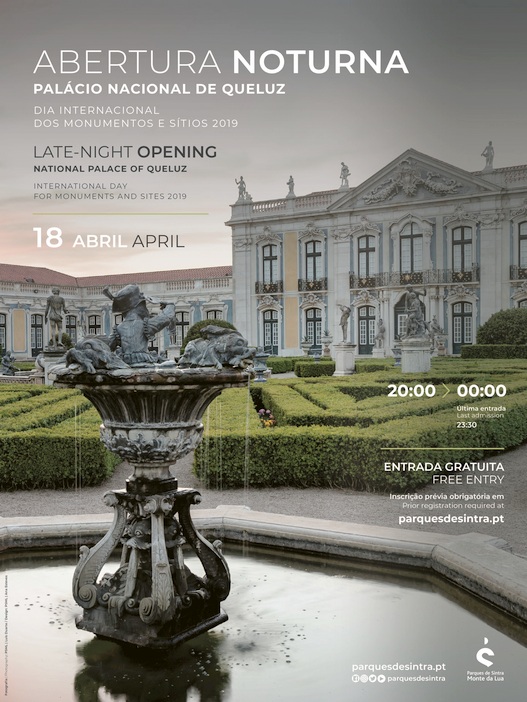 No próximo dia 18 de abril, para celebrar o Dia Internacional dos Monumentos e Sítios, o Palácio Nacional de Queluz vai estar aberto à noite. As visitas, que incluem também o acesso ao Jardim de Malta e ao Jardim Pênsil, são gratuitas e decorrem entre as 20h00 e as 00h00, sendo a última entrada às 23h30. O evento tem uma capacidade limitada a 2.800 pessoas e exige inscrição prévia.