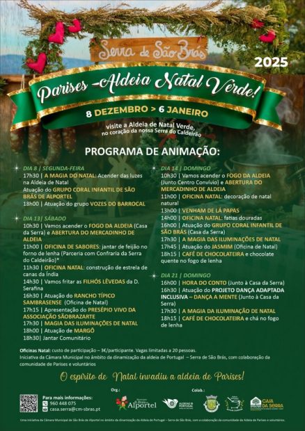 No coração da Serra do Caldeirão, em São Brás de Alportel, a aldeia de Parises transforma-se novamente na encantadora Aldeia de Natal Verde. Uma iniciativa do Município que se torna realidade graças ao empenho dos habitantes, voluntários e amigos da comunidade. A aldeia ganha vida com decorações naturais e reutilizadas, oficinas de Natal e uma programação cultural que promete encantar miúdos e graúdos. Esta celebração da tradição e da criatividade locais é possível com a organização da Câmara Municipal de São Brás de Alportel e o apoio da Junta de Freguesia.