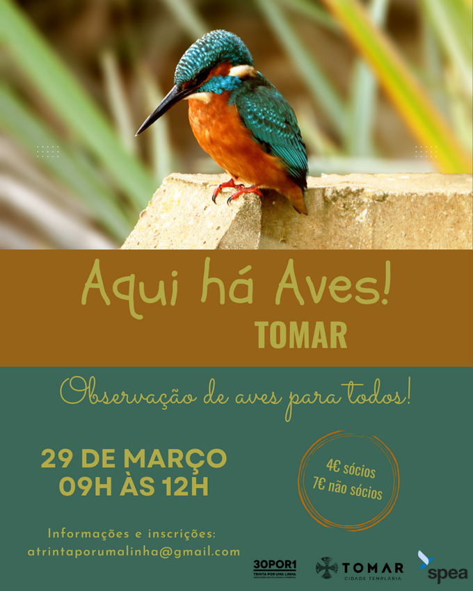 A 30POR1LINHA – Associação Sociocultural e Ambiental vem por este meio divulgar a próxima atividade do ciclo “Aqui Há Aves!”, que terá lugar no próximo dia 29 de Março, em Tomar.