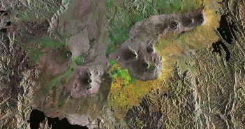 Esta imagem composta do radar Sentinel-1 caracteriza as montanhas de Virunga no Leste de África:…